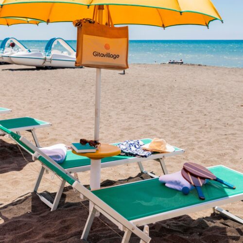 Il servizio spiaggia (1 ombrellone e 2 lettini) è incluso in tutti i villini in muratura. Per gli ospiti delle lodge è comunque possibile prenotarlo all’atto della prenotazione della sistemazione.